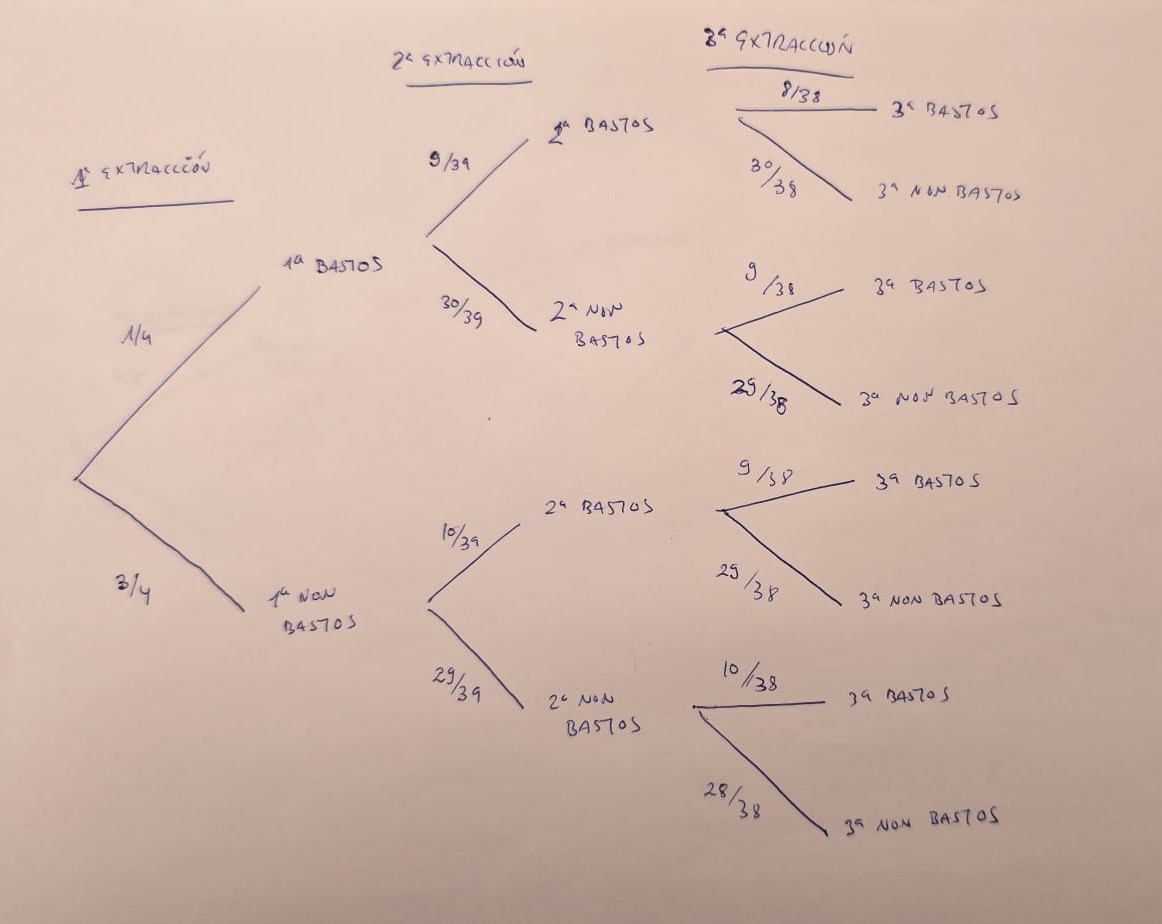 Extráense, unha tras outra, cartas dunha baralla. Cal é a probabilidade de obter bastos as tres veces? a) Supón que se extraen con remprazamento. b) Supón que se extraen sen reemprazamento.