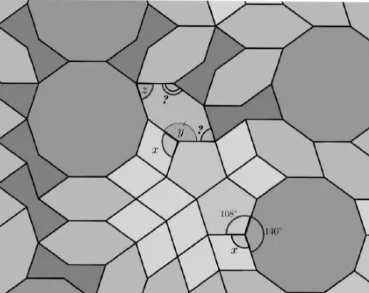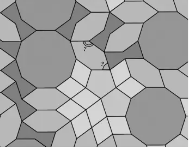 Un anaco do teselado da mesquita da cidade de Isfahan é mostrado abaixo. A figura está conformada con cinco tipos diferentes de polígonos: un pentágono e un decágono regulares, con todos os seus lados iguais en lonxitude; hexágonos que teñen catro ángulos iguais entre si e outros dous iguais. Atopa o valor dos ángulos marcados.