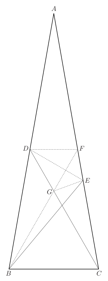 No triángulo da figura (ver abaixo) debúxase paralela a , o triángulo é equilátero, logo . Ademais, o triángulo é isósceles, posto que ten dous ángulos de , consecuentemente . Logo tense que , e o triángulo tamén é isósceles. Desta forma