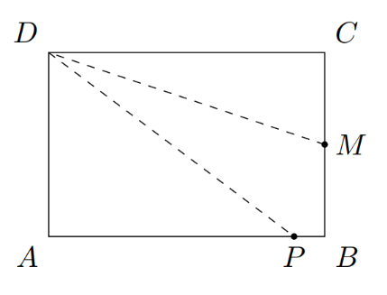 Sexa un rectángolo con lado e lado . Sexa o punto medio do lado . Sexa o único punto do lado que cumpre que a recta é a bisectriz do ángulo . Determinar a lonxitude do segmento .