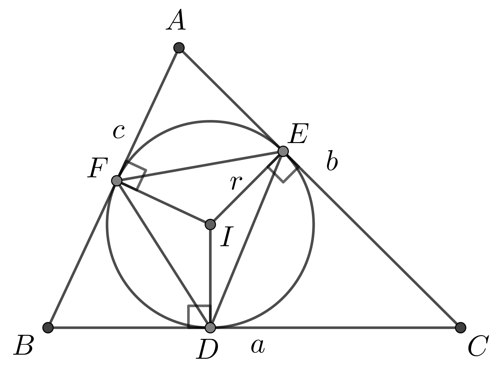 Sexan , e os puntos de tanxencia da circunferencia inscrita ao triángulo cos lados , e respectivamente. Demostra que: onde denota a área do triángulo .